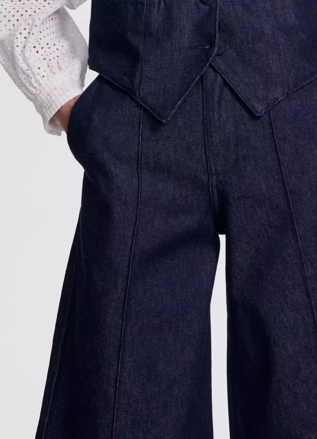 Bermuda jeans confeccionada em lavagem escura. A peça possui cós de alfaiataria, fechamento com gancho e zíper, bolso faca, vinco no centro, shape pantacourt.
