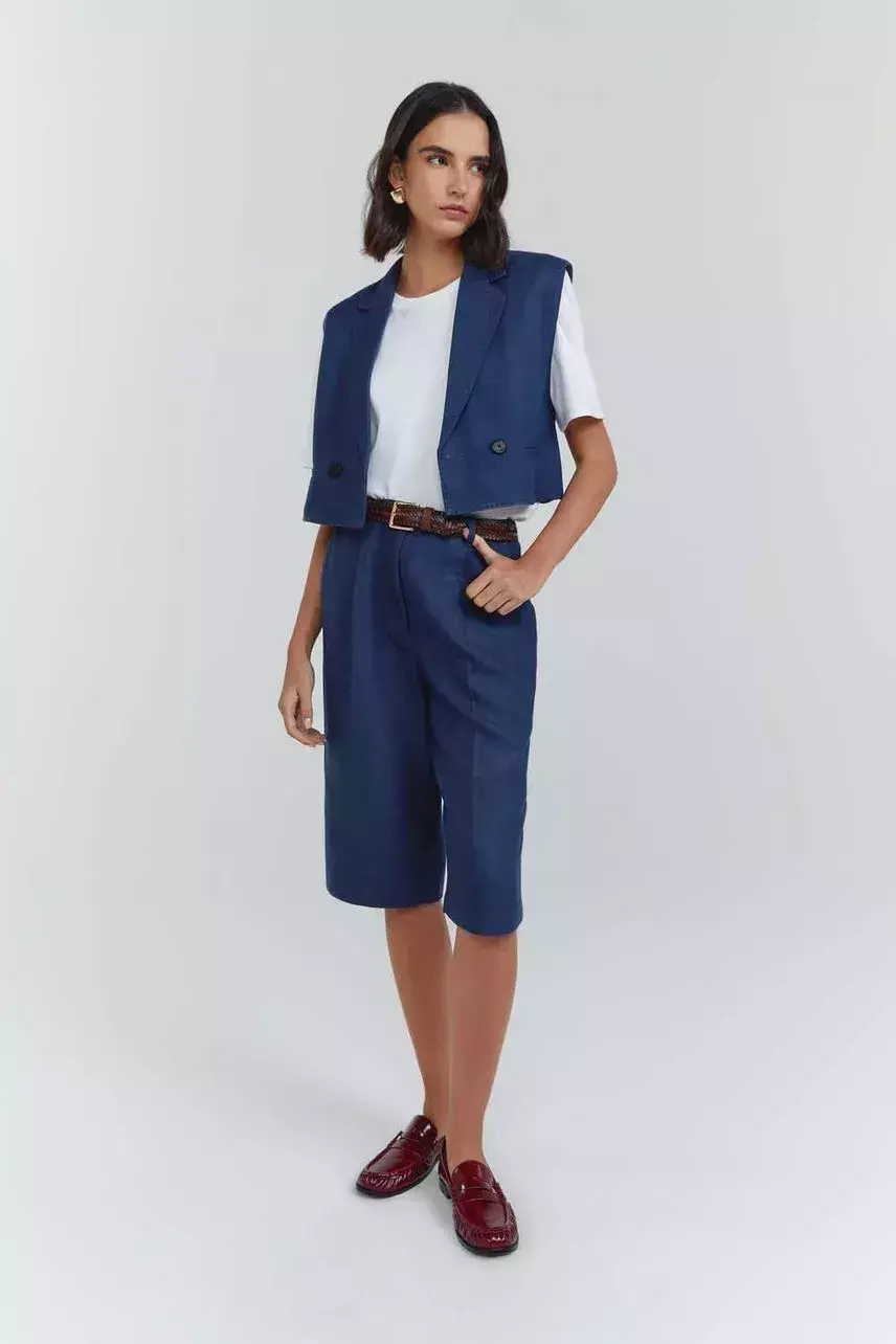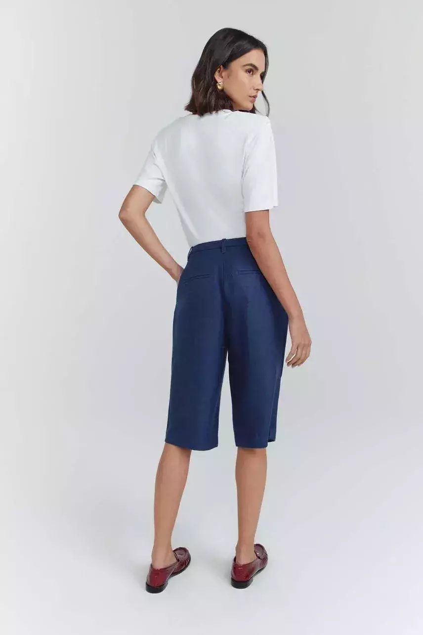 Bermuda de alfaiataria com modelagem reta e cintura média, ideal para compor visuais sofisticados com leveza. O acabamento com barra italiana e pregas frontais valoriza o caimento, enquanto os bolsos adicionam funcionalidade ao design minimalista.