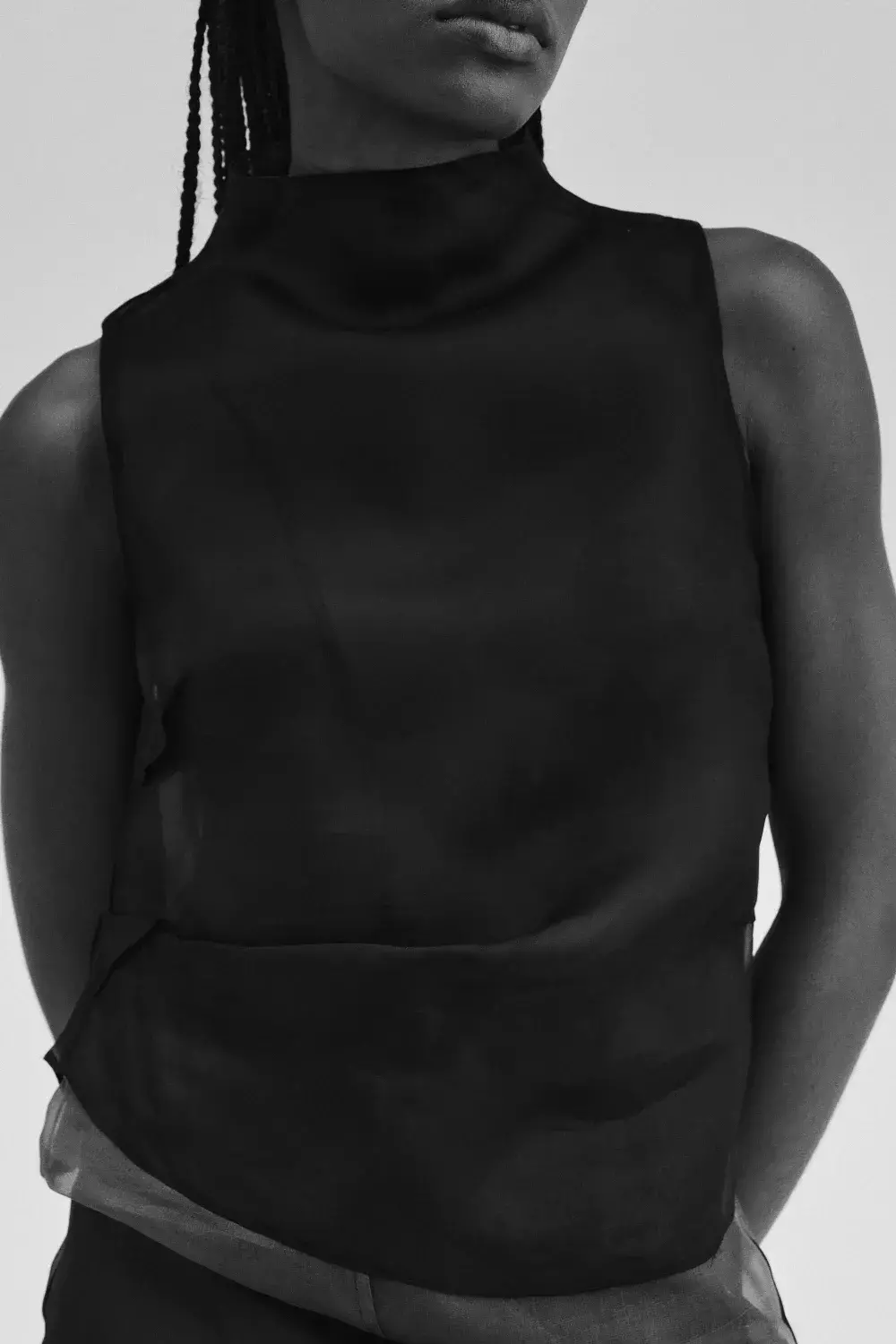 A Blusa Éden possui recortes anatômicos e modelagem ajustada, explorando a transparência da organza de forma sofisticada e com dois tecidos fazendo esse contraste. Com estrutura leve e acabamento de alto padrão, é perfeita para sobreposições ou uso solo.