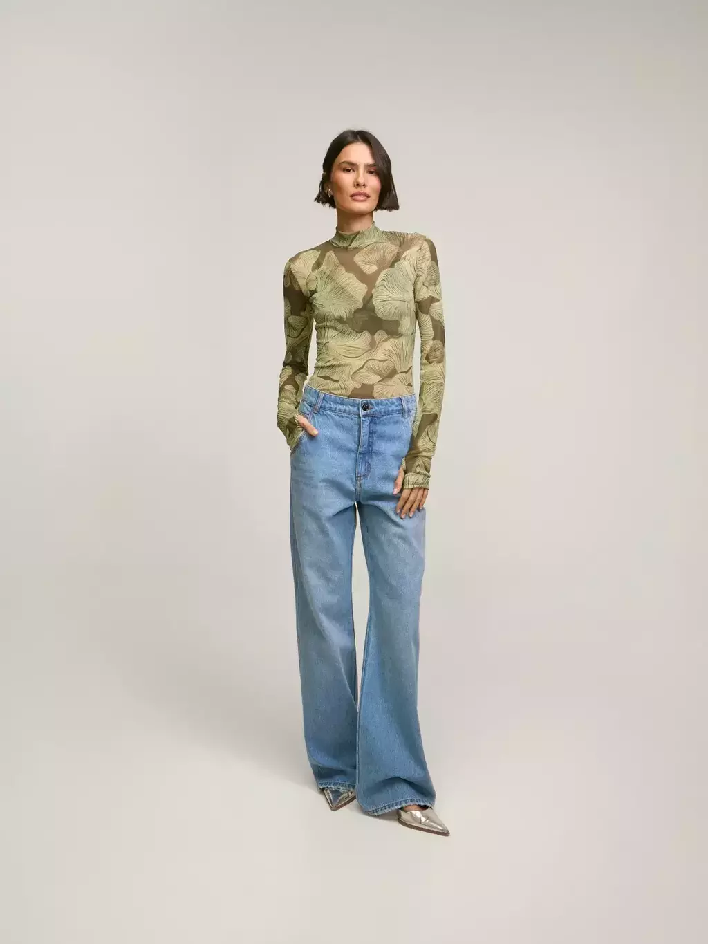 Blusa confeccionada em tule na estampa exclusiva Mushroom Organic desenhada à mão com aquarela. Possui modelagem ajustada ao corpo estilo segunda pele, manga longa e gola alta. Detalhe de passante para o dedo no punho.