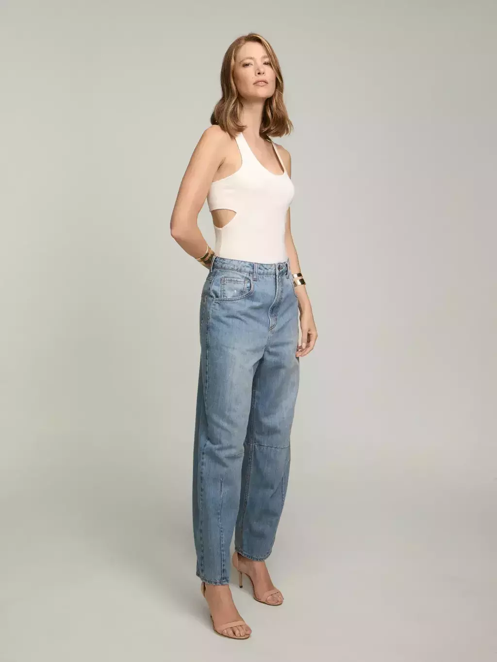 Calça confeccionada em jeans. Modelagem reta com pregas perto do joelho e no centro da perna, estilo barrel. Possui bolsos frontais e nas costas e detalhe de puídos na barra. Fechamento por botão e zíper.