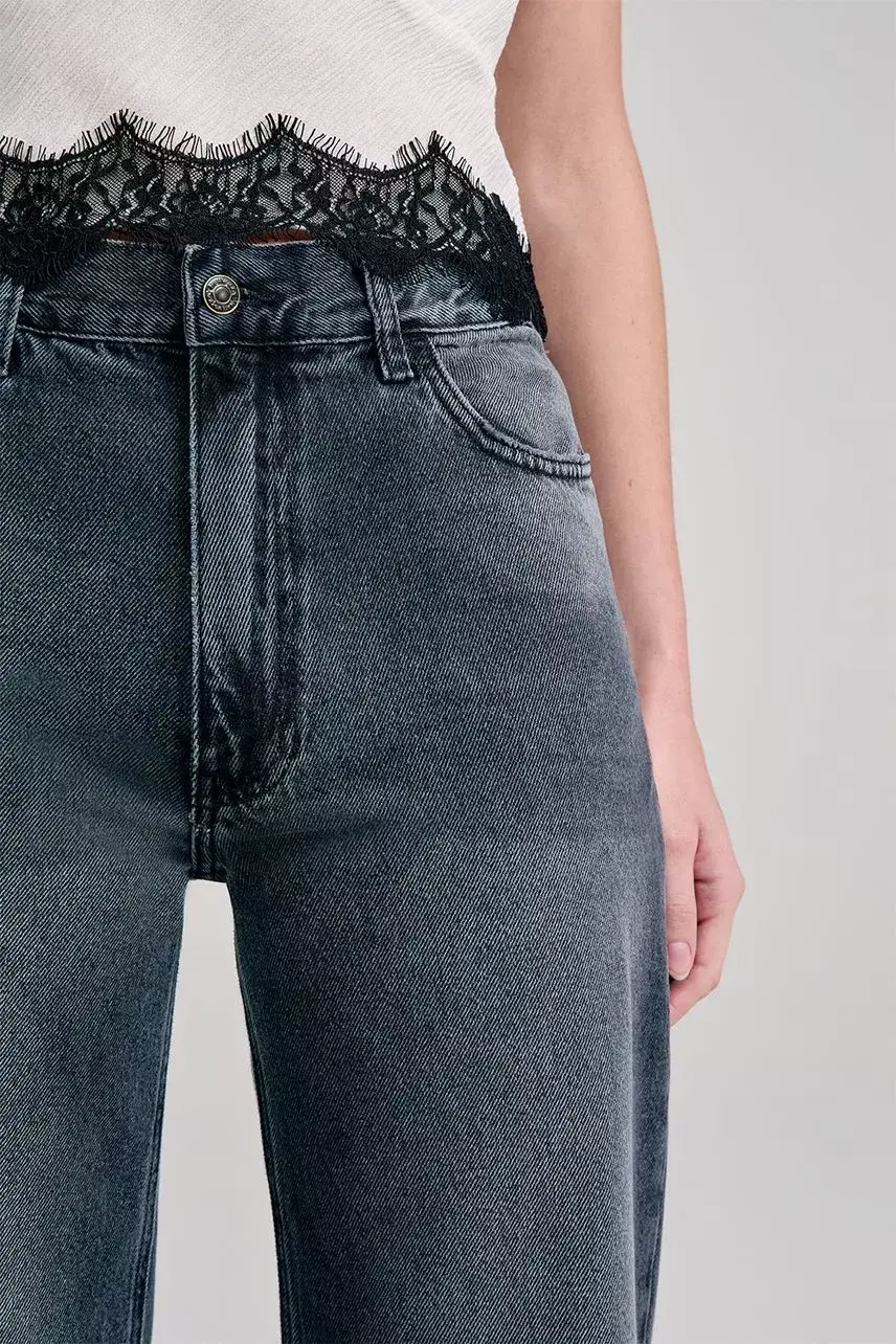 Calça jeans com modelagem reta, cintura média e comprimento longo. Possui cós reto, bolsos frontais e bolso relógio. Com fechamento em botão e zíper de metal, lavagem e barra a fio, é uma peça versátil para composições atemporais.