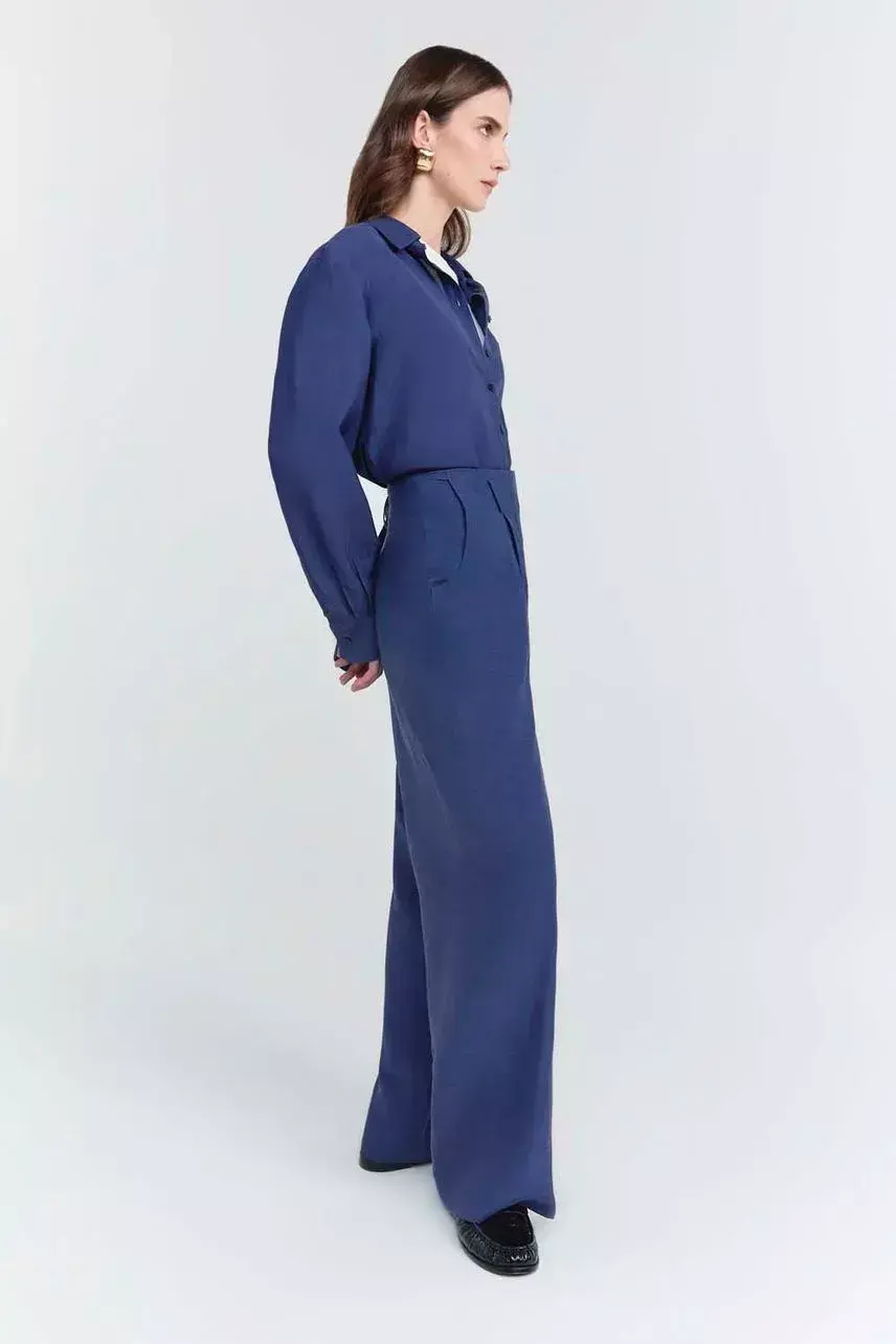 Confeccionada em linho, a calça apresenta modelagem reta e comprimento longo. Com cintura média e pregas frontais, valoriza o caimento e traz elegância ao visual. O fechamento frontal com botão interno, gancho e zíper garante acabamento sofisticado, enquanto os bolsos faca e vivo complementam a peça com praticidade. O design sem cós, com vista e transpasse diferenciado, adiciona um toque moderno à alfaiataria clássica.