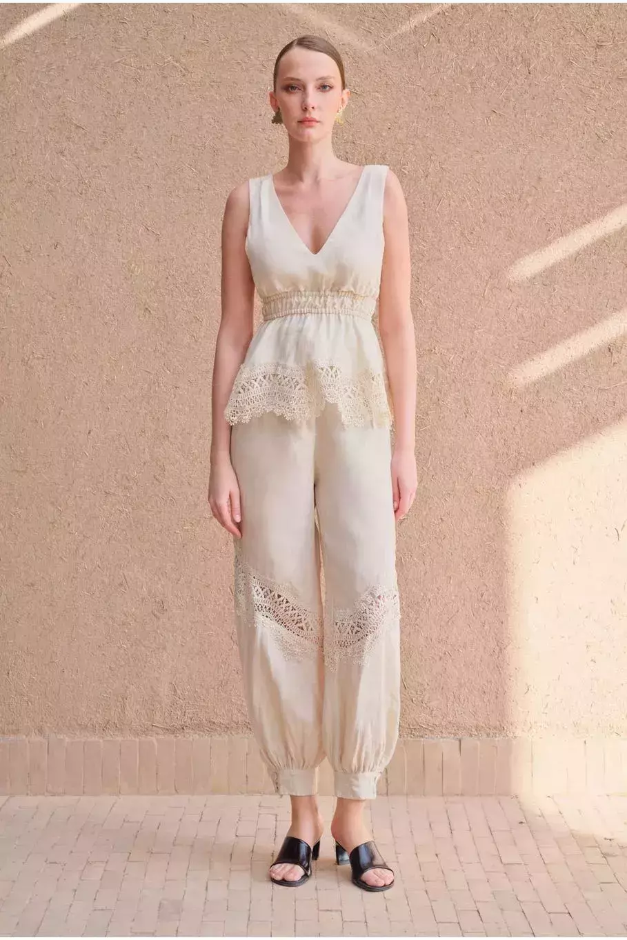 A Calça Suzana é perfeita para quem busca estilo e conforto em um único look! Confeccionada em linho de alta qualidade, no tom sofisticado polvilho, ela apresenta uma modelagem soltinha com elástico na barra, proporcionando um caimento moderno e delicado. O destaque fica por conta dos recortes em renda vazada nas pernas, que trazem um toque romântico e artesanal à peça. Essa calça é ideal para criar composições elegantes e fresquinhas nos dias mais quentes, especialmente se combinada com o top coordenado ou com blusas em tons neutros. Aposte nela para montar um visual leve, charmoso e cheio de personalidade!