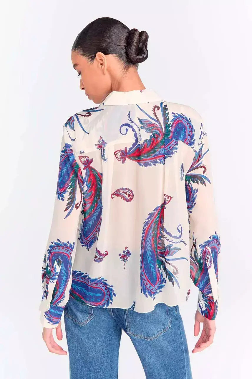 Confeccionada em viscose fluida, a camisa apresenta modelagem regular e comprimento regular. Com estampa paisley e gola clássica, traz fechamento frontal por botões de resina e mangas longas. A barra em formato lenço adiciona um toque leve e sofisticado ao visual.