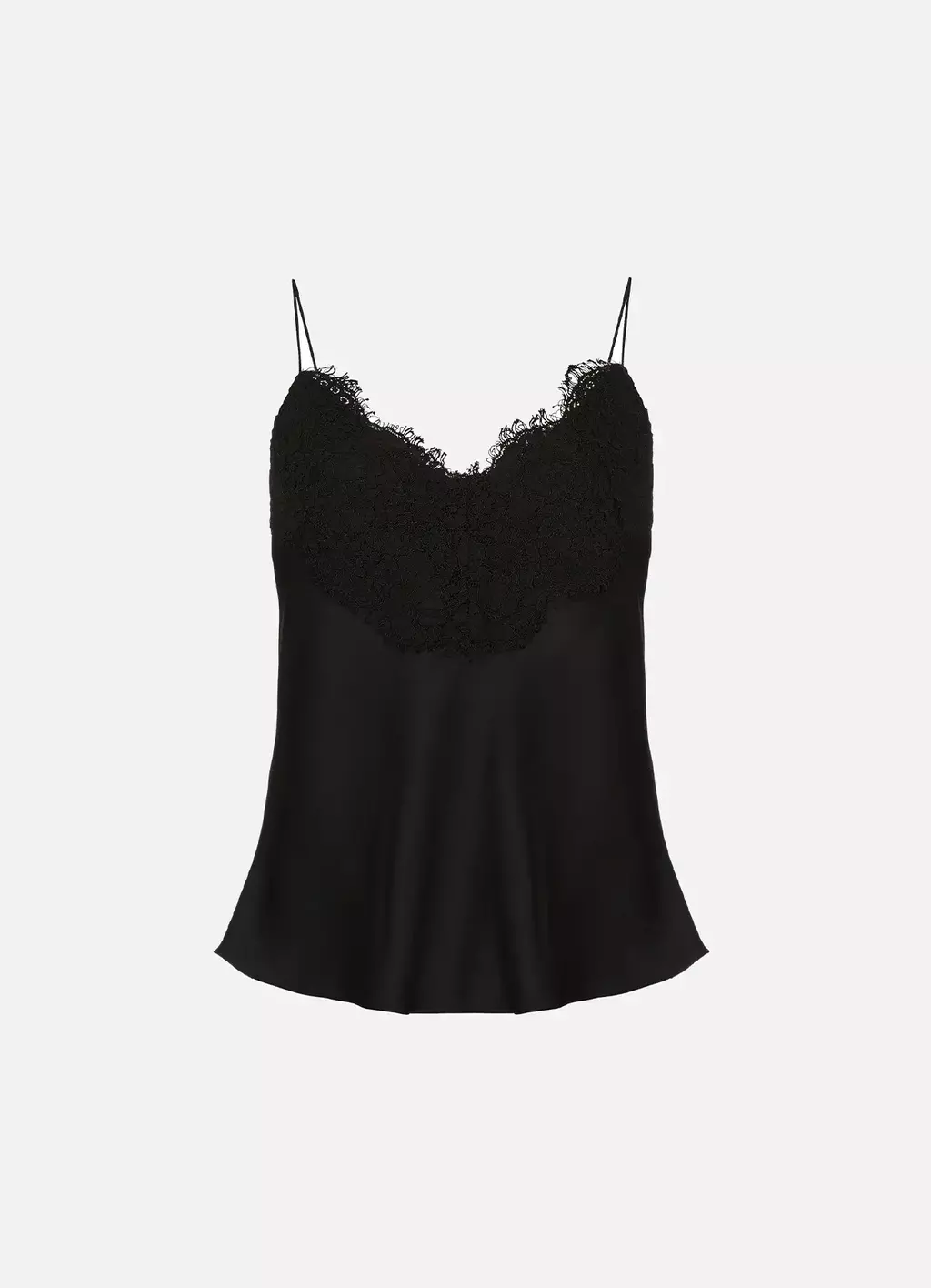 Regata na cor preta confeccionada em tecido plano. A peça possui decotes em V, renda aplicada no busto, alças finas. Modelo shape solto ao corpo.