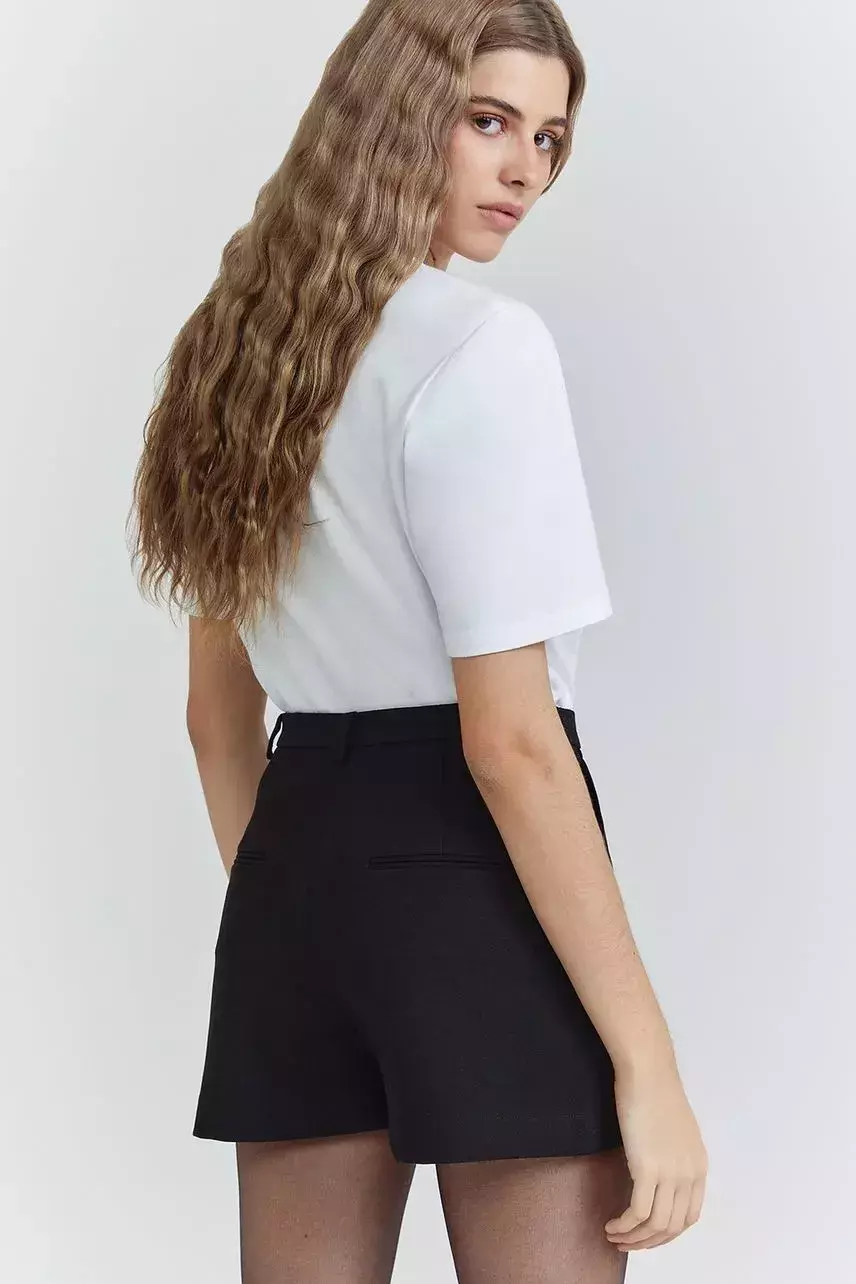 Short de alfaiataria confeccionado em crepe, com modelagem reta e cintura média. Possui fechamento frontal com zíper, gancho e botão interno, além de barra reta e bolsos funcionais. Um essencial versátil e elegante para o guarda-roupa.