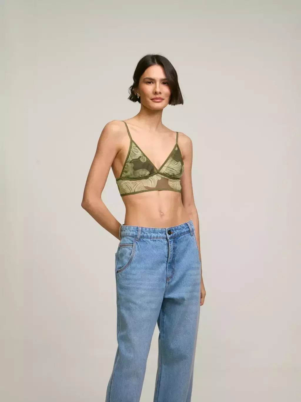 Top underwear confeccionado em tule na estampa exclusiva Mushroom Organic. Detalhe de alça com regulagem, elástico na barra e forro.